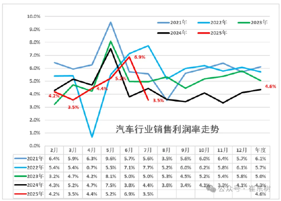 2024年汽车行业利润总体表现不强,销售利润率仅有4.3%,较历史正常水平大幅下降。2025年7月份,汽车行业销售利润率3.5%,达到近期低点。2025年1-7月份,汽车行业销售利润率4.6%,好于2024年,仍处历史次低位。