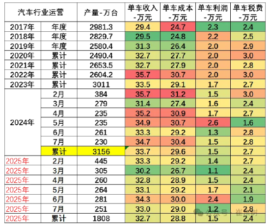 在汽车置换更新补贴政策带动下,2025年汽车生产1808万台,同比增11%。2025年1-7月的汽车行业收入59193亿元,同比增8%;成本52056亿元,增8%;利润2737亿元,同比增0.9%;汽车行业利润率4.6%,相对于下游工业企业利润率5.9%的平均水平,汽车行业仍偏低,较1-6月的4.8%利润率有所下降。其中,7月的汽车行业收入8275亿元,同比增5%;成本7276亿元,增5%;利润293亿元,同比降17%;汽车行业利润率3.5%,环比6月下降明显,相较去年7月的4.4%也是下降。