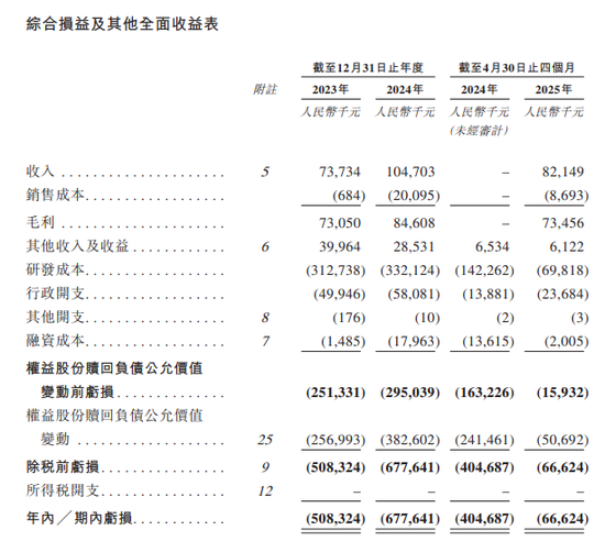 招股书显示,在过去的2023年、2024年和2025年前四个月,劲方医药的营业收入分别为人民币0.74亿、1.05亿和0.82亿元,相应的研发开支分别为人民币3.13亿、3.32亿和0.698亿元,相应的净亏损分别为人民币5.08亿、6.78亿和 0.66亿元。
